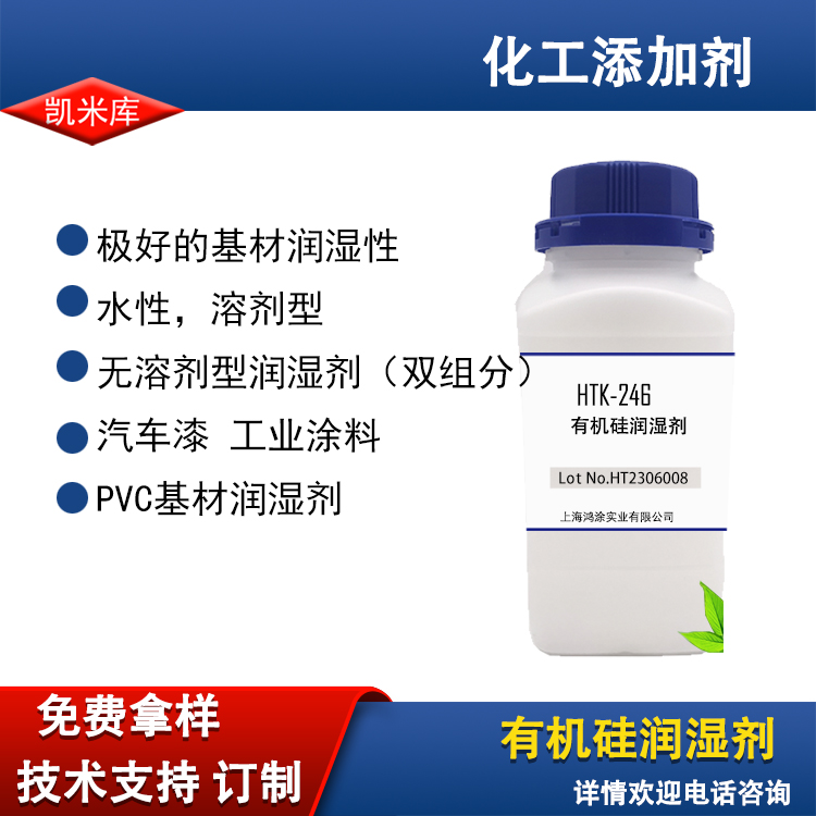 HTK-246有机硅润湿剂 主要成份为改性有机硅氧烷共聚物,优异的防缩孔,耐高温,耐酸碱, 重涂性好,促进流动作用,适用于汽车漆润湿剂、工业漆润湿剂、建筑涂料基材润湿剂、PVC基材润湿剂,及其它基材润湿剂。